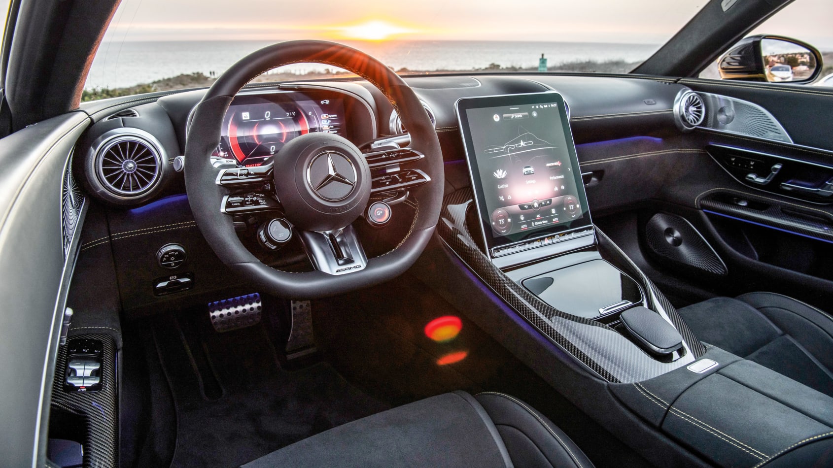 Салон такой же, как и у других SL, с двухуровневой панелью Dashboard и портретно-ориентированным сенсорным экраном в центре. Он оснащен новейшей информационно-развлекательной системой Mercedes MBUX, а его угол можно регулировать на 20 градусов, чтобы предотвратить отражение, когда крыша опущена. Также имеется 12,3-дюймовая цифровая приборная панель и множество вариантов обивки и отделки салона, включая синтетическую кожу Artico, кожу наппа и акценты из углеродного волокна.