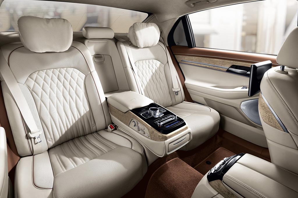 Салон полностью новый. В отделке интерьера G90 использованы стекло, алюминий и кожа. Деревянные вставки в угоду экологии сделаны с использованием переработанной макулатуры. Виртуальная «приборка» и тачскрин мультимедиасистемы все так же объединены, но при этом их разделяет декоративная вставка, растянувшаяся почти на всю переднюю панель. А еще табло теперь возвышается над передней панелью. Дефлекторы обдува спрятали в одну линию, блок управления климатом сделали сенсорным, шайбы трансмиссии и мультимедийной системы на центральной консоли различаются визуально и тактильно, причем селектор коробки вибрирует при включении задней передачи.