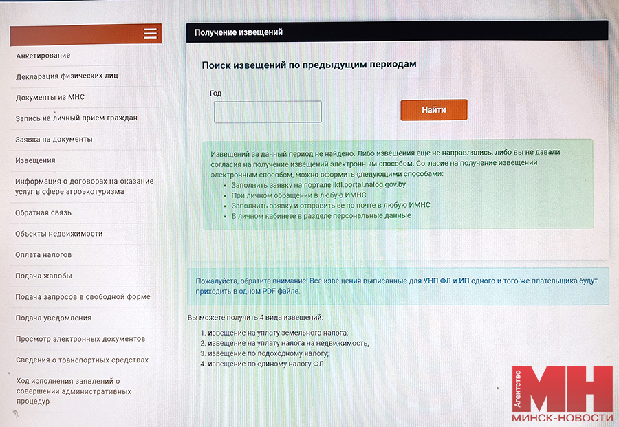 Прежде знакомлюсь с краткой инструкцией, где описаны возможности моего кабинета. Захожу в раздел «Извещения». Там читаю: «Вы можете получать 4 вида извещений: на уплату земельного налога, налога на недвижимость, по подоходному налогу, по единому налогу физлица». К моему глубокому удивлению и сожалению, транспортного налога в этом списке нет.