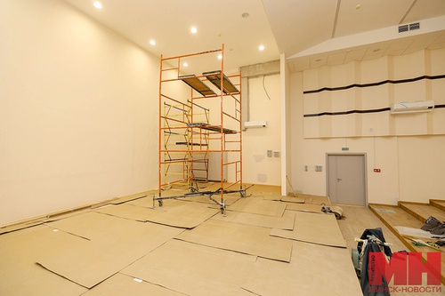 Добираемся до актового зала, который находится на втором этаже. С большего он готов: паркет уложен и покрыт лаком. Сейчас ожидают оборудование для сцены, шторы, кресла. Удивительное, но важное новшество в этом зале – система кондиционирования (она также имеется в кабинетах физики, химии, биологии, лингафонных). Актовый зал рассчитан на 280 посадочных мест и имеет аж 4 выхода. Опять же – в целях безопасности. Рядом есть несколько помещений, которые назовем приятным бонусом: костюмерная, артистическая, инвентарная. То есть переодеваться юные актеры будут не за кулисами, а в специальных комнатах.
