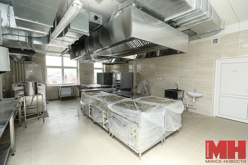 Современным получится и пищеблок. Здесь предусмотрено немало разных помещений. Например, комната отдыха для сотрудников, комната завпроизводством. А также множество цехов – горячий, холодный, рыбный, мясной, сырой продукции, для хлебобулочных изделий – плюс посудомоечная. Каждый из них оборудован всем необходимым. Что касается обеденного зала, то он рассчитан на 352 места. Рядом со входом разместится витаминный бар. Скоро здесь соберут и поставят мебель. Из обеденного зала есть запасной выход на улицу.