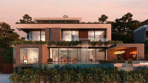 На представленных рендерах дома выглядят действительно футуристично — сложные геометрические (но непременно прямоугольные) формы, обилие стекла, архитектурная подсветка, озеленение на каждом этаже и даже собственный водопад на фасаде дома (со второго этажа в уличный бассейн). Внешний вид участков не кричит, но однозначно указывает на неплохое финансовое положение их владельцев.