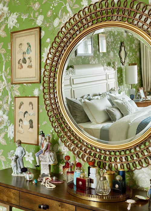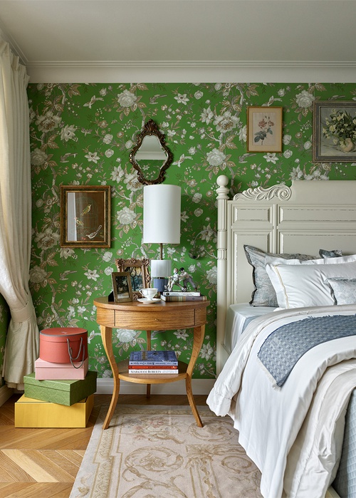 Гостиной яркие моменты в интерьере не ограничиваются — спальня в квартире тоже цветная, стены оклеены нежно-зелеными обоями с орнаментом из цветов и птиц. Интерьер наполнен множеством приятных аксессуаров — вазами, статуэтками, подушками, лампами с необычными абажурами. И из-за этого совершенно новый интерьер воспринимается как «квартира с историей», с ощущением насыщенной жизни. И так всегда и бывает, когда интерьер строится вокруг личности человека, который в нем живет.