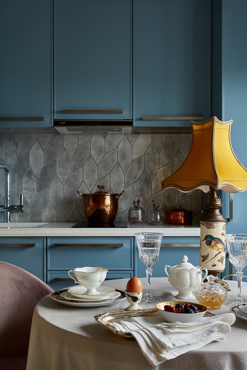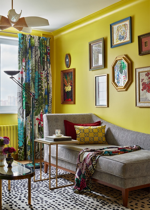 «Клиентка произвела на меня неизгладимое впечатление с первой же встречи, — рассказывает Анастасия. — Она человек необычный, с нестандартным отношением к моде, отличным вкусом и необычными коллекциями — шляп и советского фарфора. Прямо с порога она сказала, что непременно хочет видеть в квартире три вещи: золотую кухню, желтую гостиную и леопардовый принт. Заказчица и ее яркие образы стали для меня главными источниками вдохновения на этом проекте». Сразу стало понятно, что интерьер получится не рядовой, ведь обычно клиенты приходят к дизайнерам с формулировками из разряда «вневременной стиль» и «ощущение уюта».