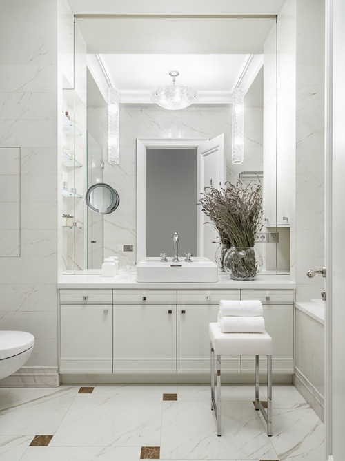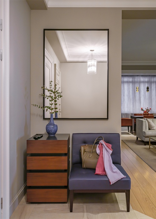 Поскольку большая часть строительных работ в квартире площадью 125 кв. м уже состоялась, перепланировку решили не делать, чтобы не увеличивать без нужды стоимость ремонта. Тем более что распределение помещений в целом было логичным: холл, гостиная с проемом на кухню, кабинет, спальня и два санитарных узла, хозяйский и гостевой. Корректировки производили «по месту», малой кровью — например, существенно переработали план размещения электрических розеток. Между прихожей и гостиной поставили стену, визуально и функционально разграничив некогда единое помещение. В спальне выделили отдельную гардеробную. Излишне декоративную плитку, уже уложенную в ванной, не стали сбивать, а просто закрыли сплошь зеркальной стеной, что придало помещению воздуха и объема. А вот уже смонтированную классическую кухню оставили — она слегка контрастирует с остальной квартирой, но выглядит тепло и уютно. Тем более что хозяйка квартиры прекрасно готовит, и некая домашность кухни сморится вполне гармонично.