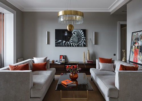 Верный признак хорошего интерьера — ситуация, при которой случайный вроде бы элемент, внесенный в него жизнью, оказывается абсолютно на своем месте. В этой квартире таких моментов два. Первый — люстра в гостиной. Ее украшает эффектный большой золотой шар. Он, на самом деле, не является частью дизайна люстры: это реальный елочный шар, который хозяйке подарил кто-то из гостей. Она повесила его на светильник шутки ради — и он остался насовсем, поскольку идеально вписался в композицию. Второй — эффектное изображение зебры на одной из стен. Это не арт-фото, как можно было бы подумать. Это заставка телевизора — и это тот случай, когда никакого более эффектного искусства в комнате не нужно.
