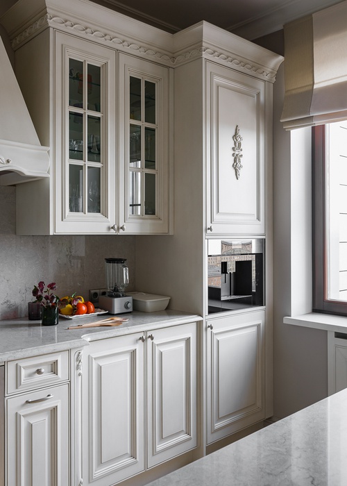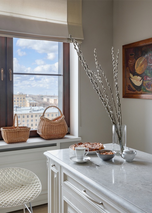 Пространства, выкрашенные в светлые теплые цвета, дизайнеры обставили мебелью европейских брендов. Многие предметы были кастомизированы по их эскизам, чтобы вписаться в нужные размеры. Многие элементы декора — вазы, посуду, текстиль — выбирала сама клиентка, и эти придает интерьеру еще больше ощущения жизни.