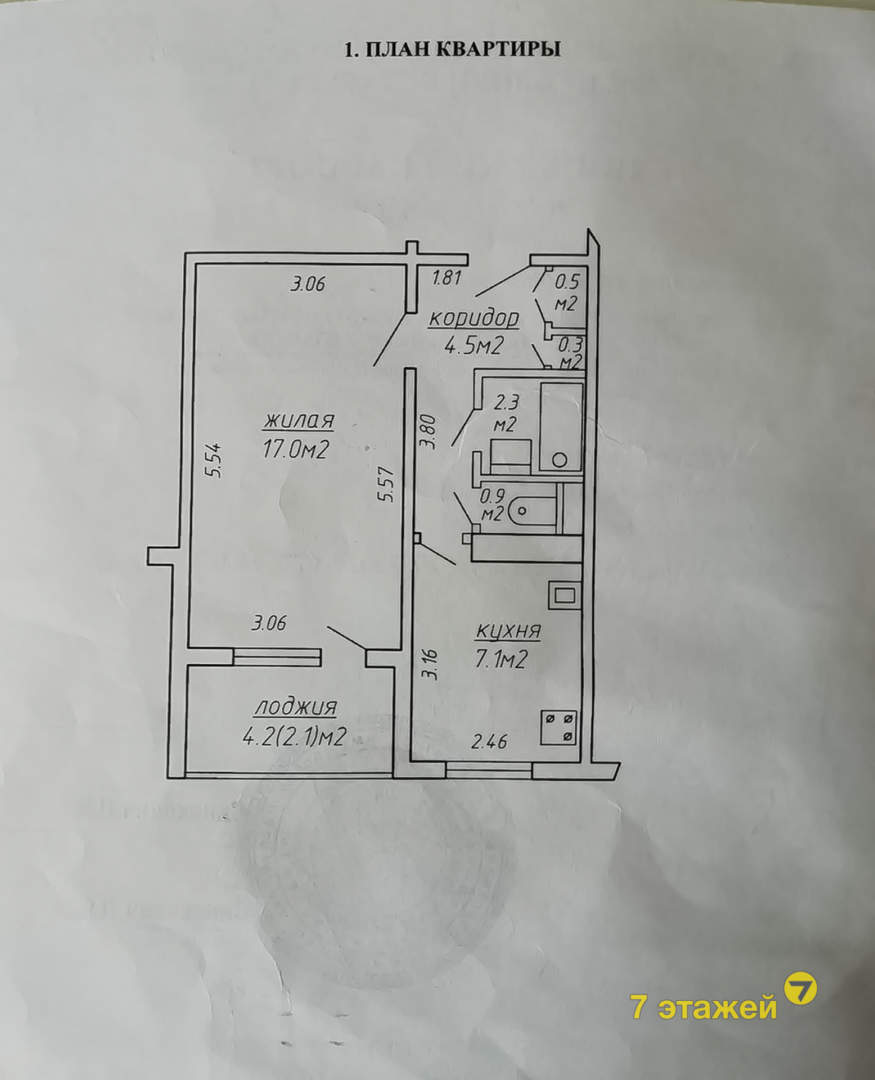 Общая площадь квартиры — 45,6 м2, жилая — 17,1 м2. Кухня — 7,1 м2. Панельная девятиэтажка построена в 1977 г., есть балкон.