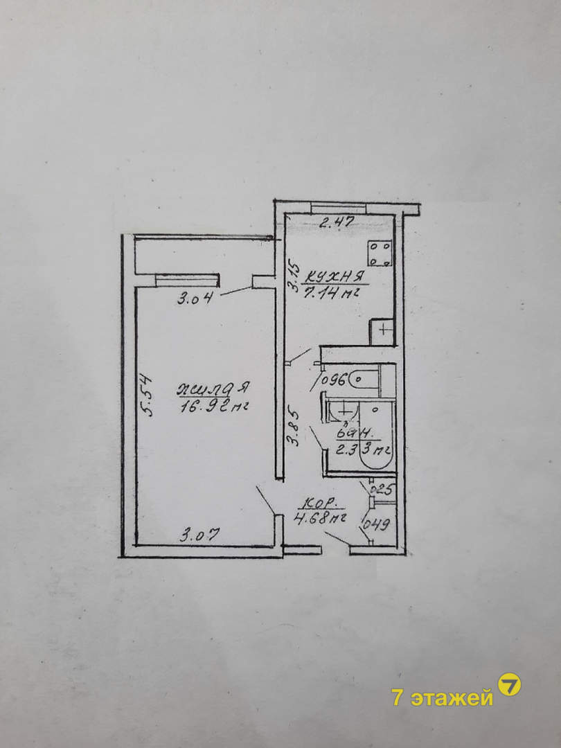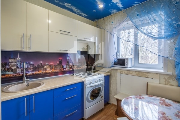 Следующая однушка находится в Зеленом Луге — одном из самых популярных и чистых районов столицы. Общая площадь квартиры — 35 м2, жилая — 16,9 м2. Кухня — 7,1 м2. Панельный дом возведен в 1984 г., есть балкон.