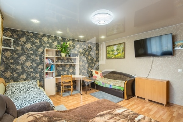 Аккуратный дом, чистый подъезд. Закончен капремонт. Квартира улучшенной планировки. В комнате есть два окна на разные стороны. Огромная застекленная двойная лоджия площадью 8 м2. В просторной комнате, советуют хозяева, можно организовать кабинет или другое помещение. Есть кладовка, она же гардеробная.
