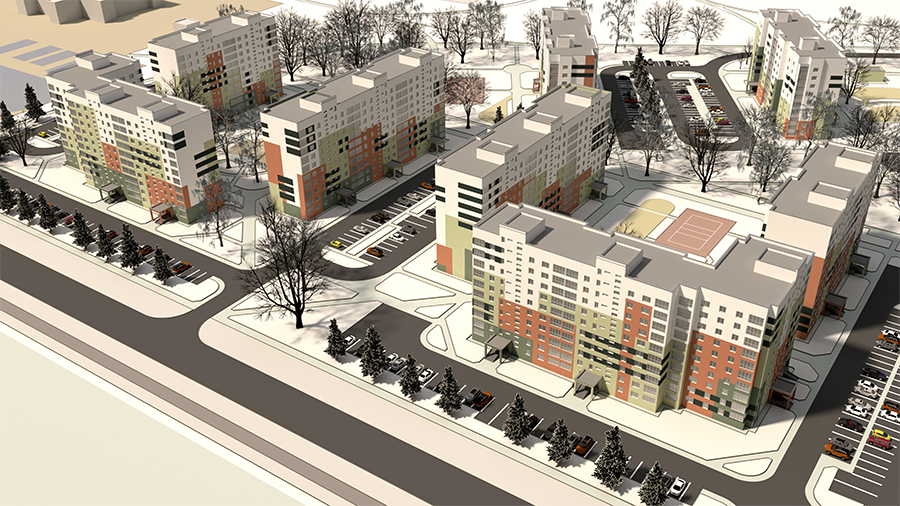 Территория, отведенная под многоквартирное жилье, ограничена ул. Ромашкина — продолжением ул. Гризодубовой, земельным участком существующей школы и зеленой зоной. Здесь на 10 га намечено построить 9 домов в индустриальном исполнении. Часть будет возводить «МАПИД», часть — Минский домостроительный комбинат. Здания планируются в 9–10 этажей, в каждом — 2 или 3 подъезда. Всего около 850 квартир. Сейчас эта плoщадка свободна, на ней даже зеленых насаждений практически нет.