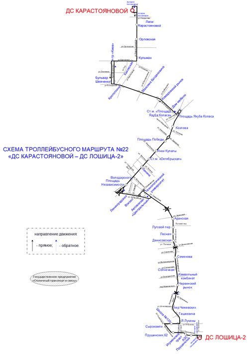 С 1 июня городской троллейбус № 22 следует по продленному маршруту в Лошицу. Теперь его трасса пролегает по пр. Независимости до ул. Бобруйской, а далее — по ул. Свердлова, Маяковского, Игуменскому тракту, ул. Я. Лучины и Прушинских. Конечная остановка — ДС «Лошица-2».
