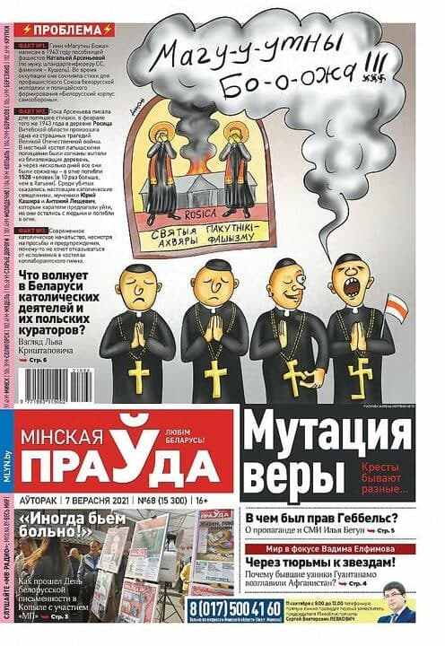 В номере газеты «Минская правда» (№ 68 от 7 сентября 2021 года), учредителем которой является Минский облисполком, на первой странице публикуется карикатура на Антона Островского. На снимке изображены католические священники в характерных одеждах, свастика, бело-красно-белый флаг, дополненные словами белорусского христианского гимна «Бог Всемогущий» на фоне искаженной реплики иконы Розицких мучеников — священники, которые мужественно приняли смерть во время Второй мировой войны от рук нацистских палачей. Изображение подписано на русском языке: «Мутация веры. Крестики разные…».
