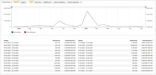 Так, на момент блокировки Роскомнадзором основного сайта Навального в июле 2021 года количество запросов о ФБК уже упало до отметки 34 тыс., то есть снизилось в девять раз по сравнению с январём.