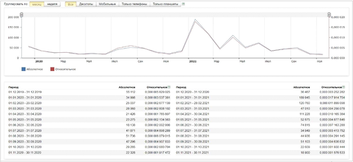 Данные сервиса «Яндекс Wordstat» охватывают почти весь 2021 год (кроме декабря, отнесённого к следующему статистическому циклу). Согласно результатам исследования, в ноябре 2021 года запросы в поисковых системах по ключевому слову «ФБК» составили 18,9 тыс. кликов — это вторая наименьшая месячная отметка за два года анализа Рунета.
