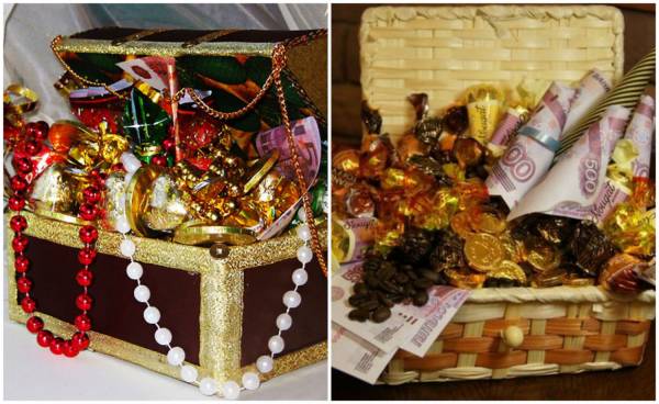 Купюры в пиратском сундуке или в шкатулке с драгоценностями. Необязательно наполнять сокровищницу только деньгами. Для красоты можно положить внутрь разноцветные камешки, имитирующие жемчуга и рубины, для сладкоежек – россыпь конфет и шоколадок, для модниц – ассорти из женских штучек. Если вечеринка проходит на природе, можно подарить имениннику таинственную карту и весело обыграть поиск сокровищ.