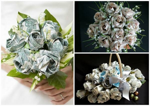 Нетрудно догадаться, как красиво подарить деньги на юбилей женщине, которая любит цветы. Составим букет из банкнот! В сети куча простых мастер-классов по изготовлению бутонов из бумаги. Выбираем МК, в основе которого прямоугольник, складываем бутоны, закрепляем на трубочки для коктейлей или на стебельки от разобранных искусственных цветов. Чтобы спрятать стебли, сделать сердцевину бутона, листики, бабочек и прочие украшательства, которые требуют нещадно мять и кромсать бумагу, используем бутафорские распечатанные купюры.