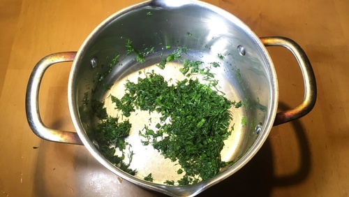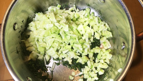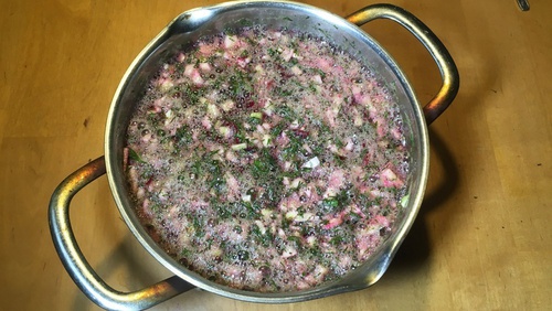 Пока отваривается свекла, можно сделать небольшую заготовку. Берем на глаз зеленого лука и укропа, сколько вам нравится. Мелко нарезаем и отправляем в кастрюлю, где будет готовиться холодник. К зелени добавляем пару чайных ложек соли и хорошенько растираем, чтобы появился сок. Это добавит супу дополнительного вкуса. В принципе, по примеру окрошки, можно растереть с зеленью и солью еще яичный желток. Это известная технология, но я, в угоду красоте, оставил забавы с яйцом напоследок.