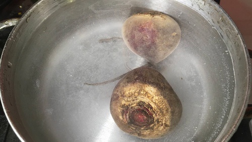 Традиционно холодник готовится из молодой свеклы, которая очень нежная. Да и варить ее надо меньше. Вымоем хорошенько свеклу и отправим в кастрюлю отвариваться. В принципе, можно запечь и в фольге, если вам нравится. Однако нагревать духовку я не рискнул. Варка у меня заняла около часа, но точное время зависит от размера корнеплода. Важно сварить свеклу до мягкости, ведь больше мы ее обрабатывать не будем. И да, если в воду добавить немного столового уксуса, то овощ сохранит свой рубиновый цвет.
