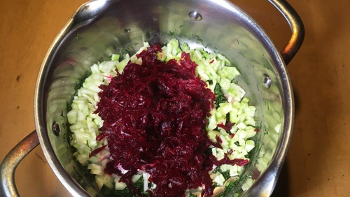 Последний и самый важный компонент — это, конечно, свекла, которая уже сварилась. Чистим ее и натираем на крупной терке туда же, в кастрюлю. Основа для холодника практически готова.
