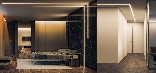 Для этого можно использовать надпольную подсветку в плинтусах со специальным желобом, а также монтировать ее в нишах, вдоль верхнего плинтуса шкафа-купе, по периметру двери или антресолей.
