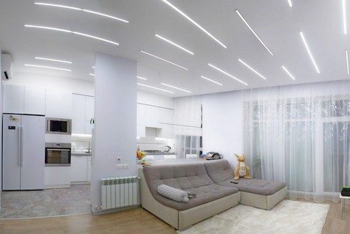 В дизайне гостиной светодиоды помогут сделать акцент на отдельных предметах декора (картинах, фотографиях, нишах со статуэтками) и техники (телевизора в частности), а также зонировать пространство. Последний метод особенно хорош для квартир-студий. В этом случае можно обозначить границу перехода комнаты в кухню напольной подсветкой.